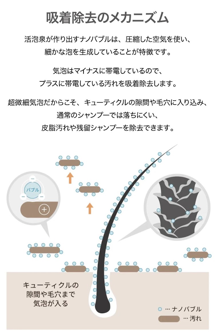 このナノバブルが毛穴やキューティクルの隙間に入り込み、通常のシャンプーで落ちにくい皮脂汚れや残留シャンプーをやさしく除去してくれるのです🚿