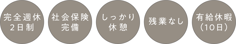 完全週休2日制、社会保険完備、有給休暇、十分な休憩時間の確保など、スタッフが長く安心して働ける環境を整えています。