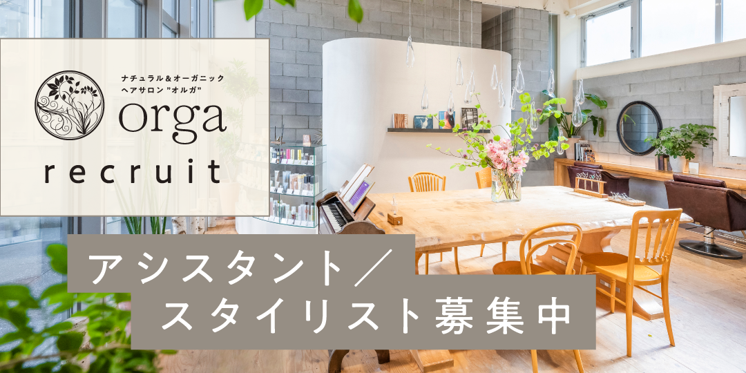 また、店内は木・珪藻土・生花・アロマなど、自然の素材にこだわった内装です。orgaが大切にしている「ナチュラル&オーガニック」な空間で、技術と感性を育んでいきましょう。